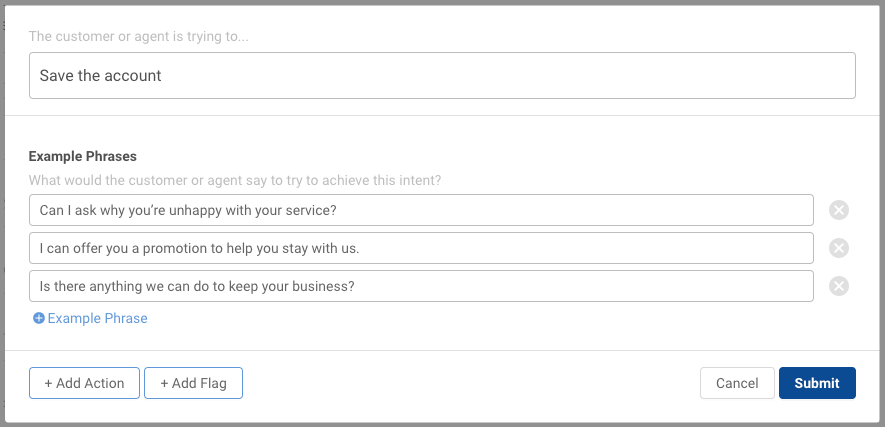 To further fine tune the AI, we also show you “near-miss” phrases from similar conversations in the past that almost match the intent, which you can add or reject.