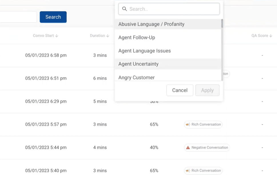 Another aspect of QA is listening to calls to identify specific characteristics like requiring help from other agents or supervisors, having a longer-than-expected duration, or containing certain negative metrics.
