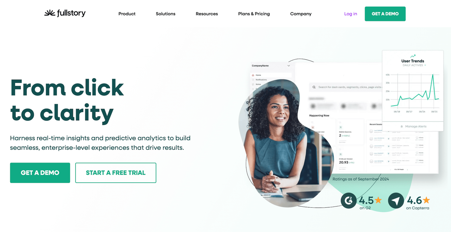 Fullstory offers a free plan and a two-week free trial of the Business plan that includes session insights and product analytics, as well as full data capture with their Fullcapture features.