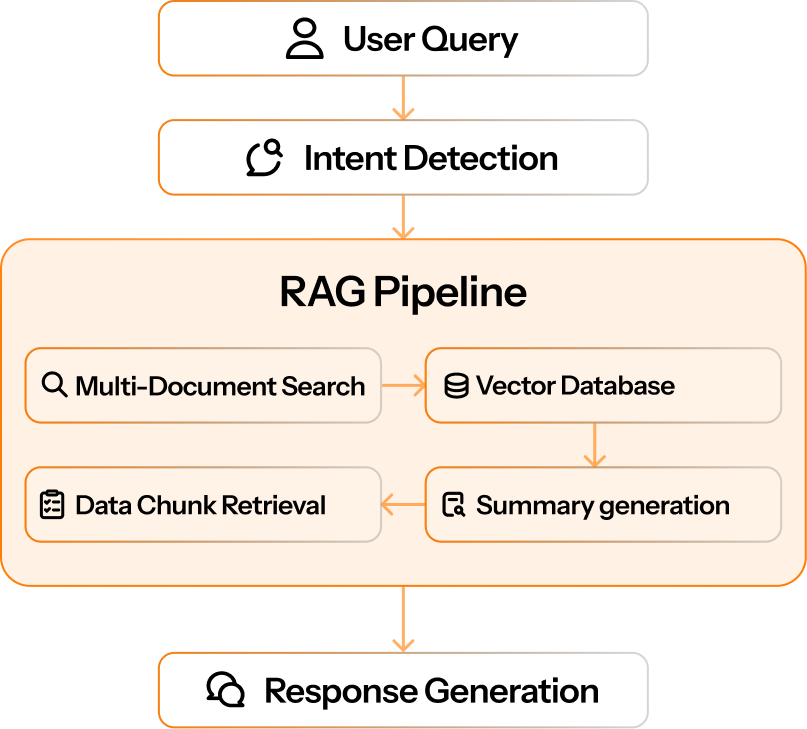 Imagine an expert researcher meticulously combing through a vast, organized library to find the most relevant facts, then handing them to a brilliant, articulate scholar who transforms them into a clear, contextual answer. That’s the essence of RAG. Our RAG based architecture uses semantic search to retrieve the right information and then leverages an LLM to generate a final response grounded in that retrieved context.