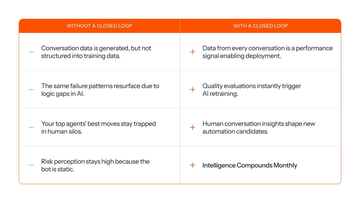 Every customer interaction that isn't captured, evaluated, and fed back into your system is a wasted training opportunity. Unlike a product roadmap or a backlogged feature, you cannot recover a conversation. That interaction happened once; the signal either strengthened your system, or it evaporated.
