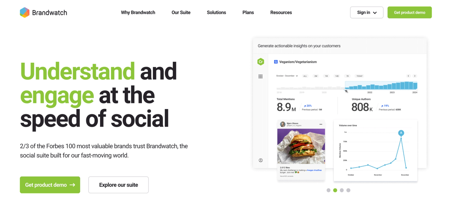 - Generative AI assistant: Brandwatch’s Iris finds customer conversations, collects feedback, and transforms data into human-readable insights instantly.
