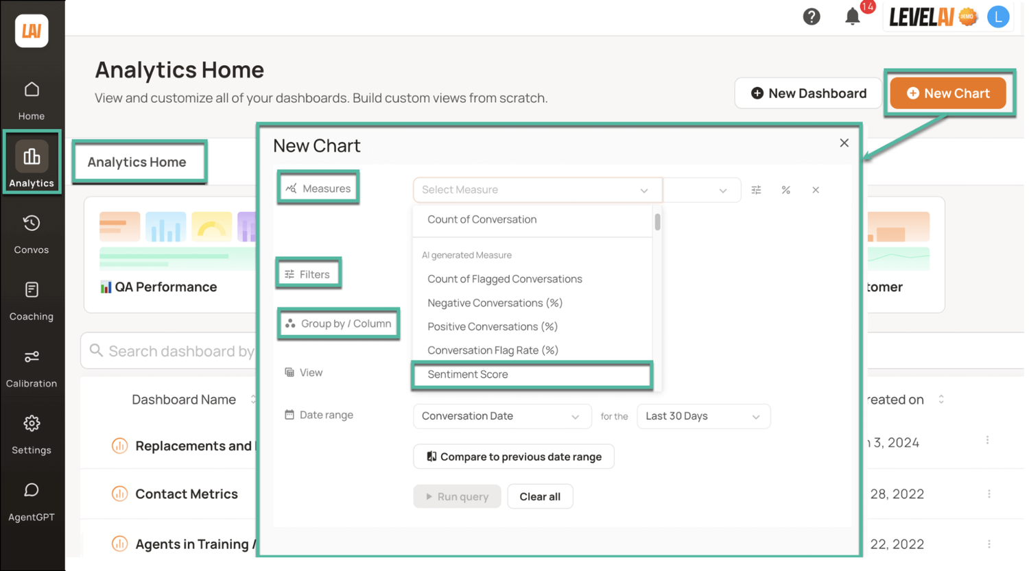 Level AI’s Query Builder allows you to build tailored reports by selecting data sources that are both internal to the platform and external, such as from your current CRM, knowledge base, ticketing system, survey tool, and more.