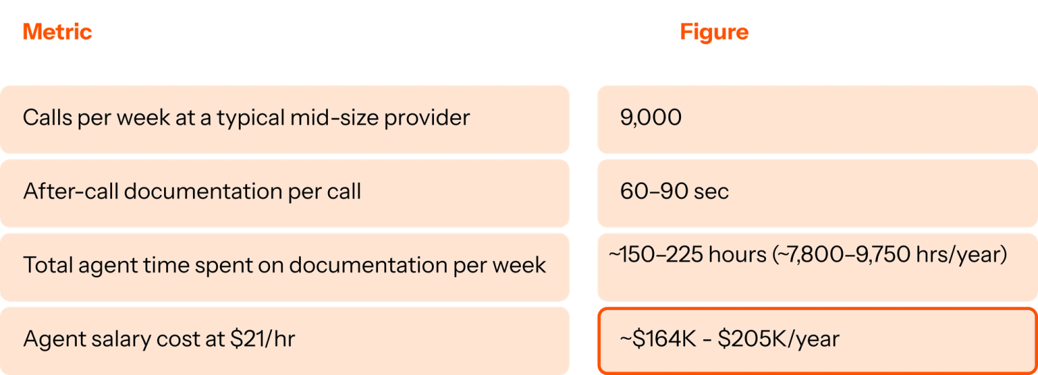 Even using the most conservative end of range, the math is stark: over $3M per year spent on calls that required zero clinical judgment. The cost table above only captures the call itself. It doesn’t count what happens after the patient hangs up. In healthcare contact centers, agents manually create telephone encounters in the EMR, log intake information, and route cases after every interaction, tasks that add 60–90 seconds of wrap-up time to every single call.