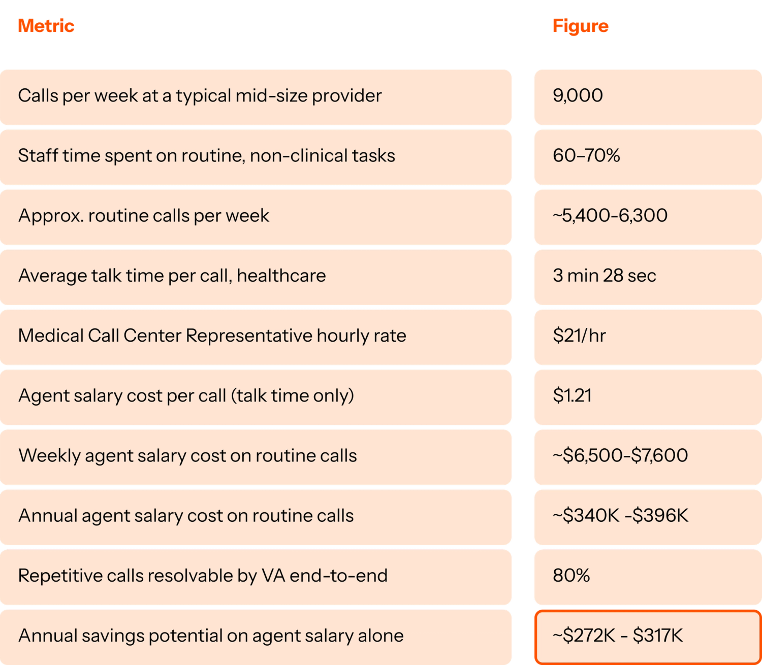 Medical Call Center Representatives in the US earn an average of $21/hour. (Salary.com, April 2026) The average talk time per call in healthcare is 3 minutes and 28 seconds. (HubSpot) That puts the agent salary cost at $1.21 per call in talk time alone.