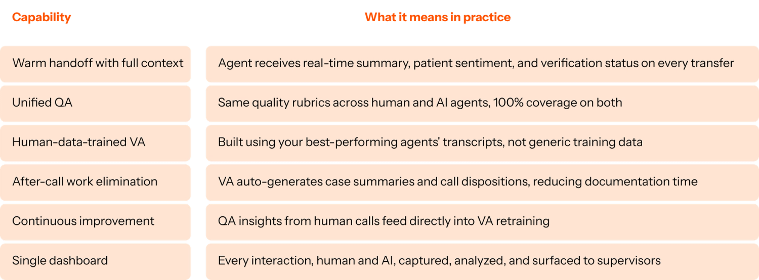 A warm handoff means the agent receives, in real time: a full call summary, the patient sentiment score, identity verification status, and what the AI virtual agent already tried. The patient picks up exactly where they left off. This is not a feature. It is the baseline requirement for running humans and AI as a single CX operation.