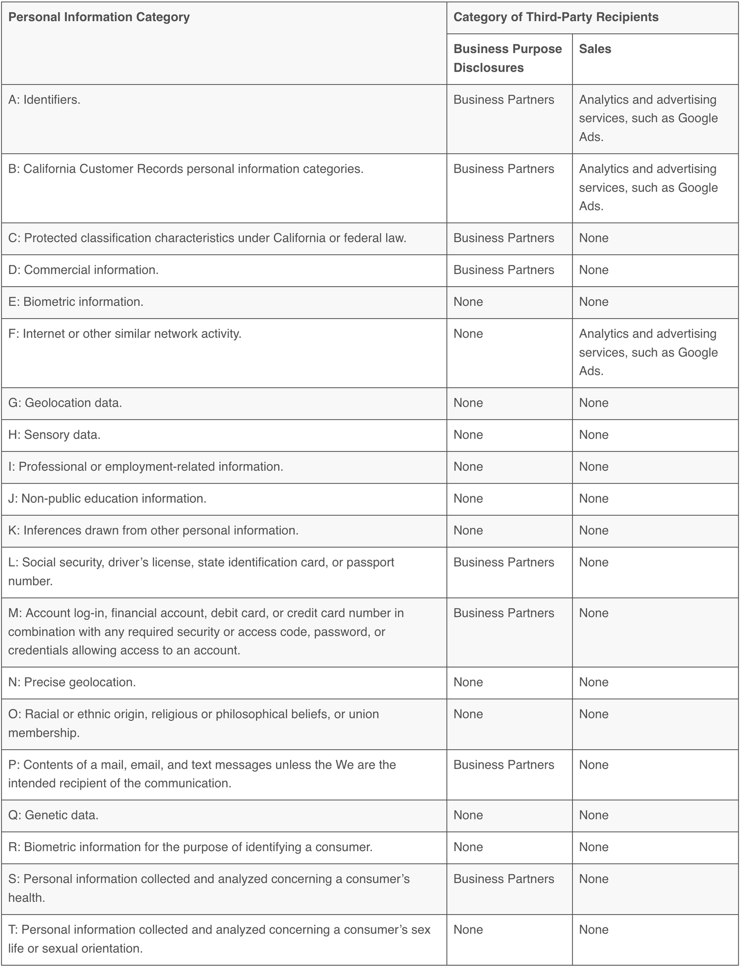 We may disclose your information to certain outside persons or organizations (“Outside Person”), including but not limited to service providers, for a business purpose. We only make these business purpose disclosures under written contracts that, among other things: (i) describe the business purposes; (ii) require the Outside Person to comply with the CCPA, including providing the same level of privacy protection as the CCPA requires; (iii) require the Outside Person to notify Us if the Outside Person can no longer meet its obligations under the CCPA and prohibit the Outside Person; and (iv) prohibit using the disclosed information for any purpose except performing such contract. In the preceding twelve (12) months, Company has disclosed personal information for a business purpose to the categories of third parties indicated in the chart below.