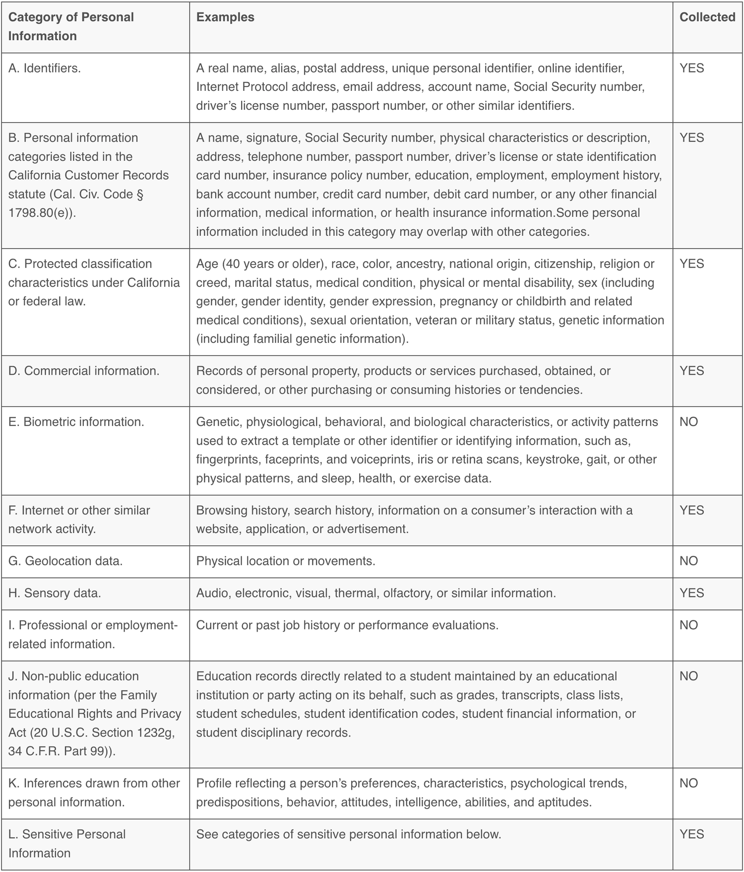 In particular, our Platform has collected the following categories of personal information and/or sensitive personal information from consumers within the last twelve (12) months: