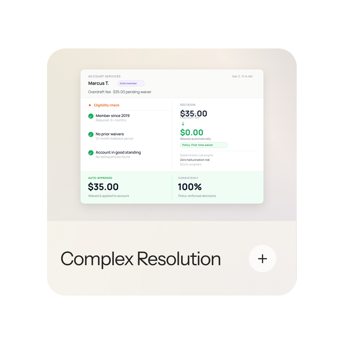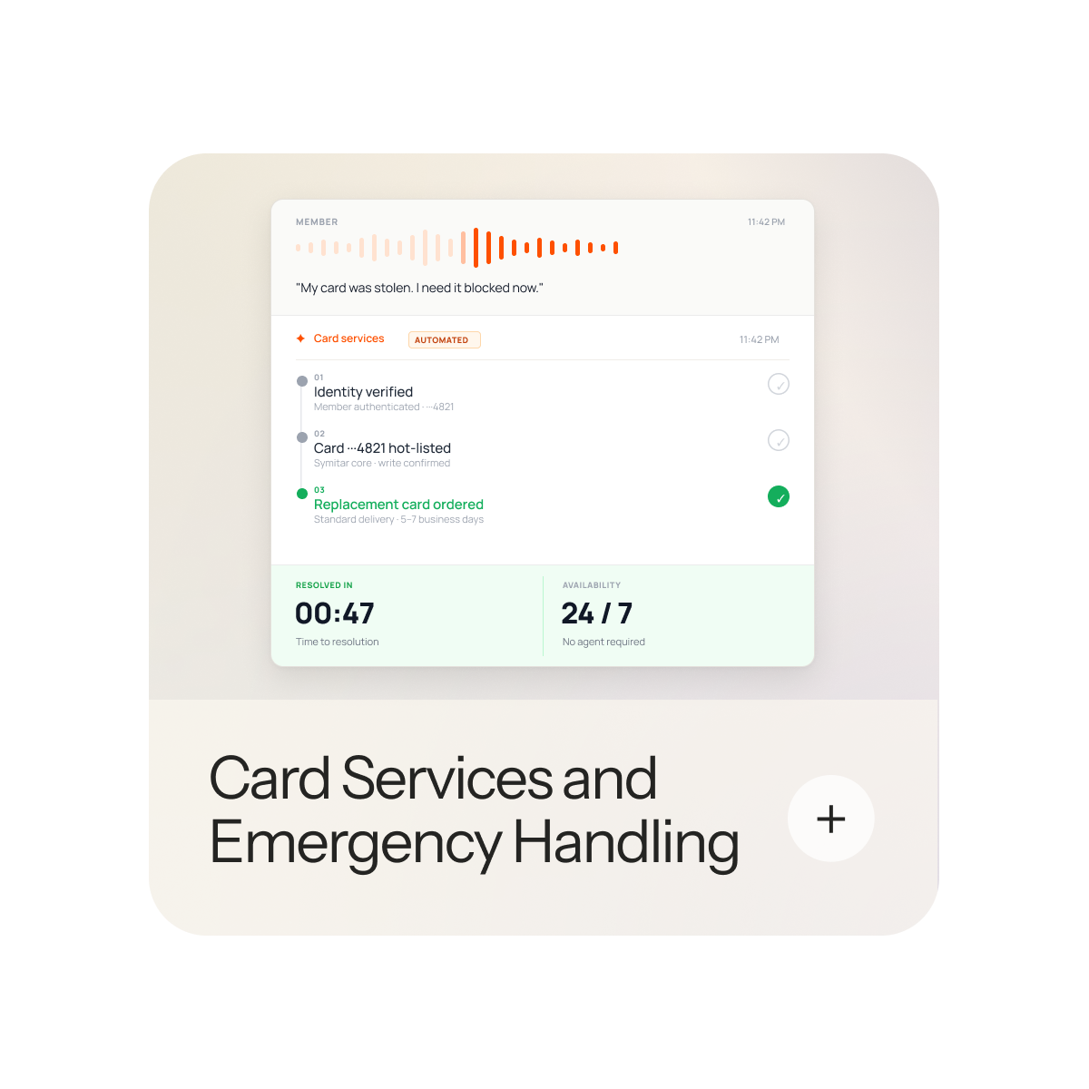 From a stolen card to a travel notice, members get resolution the moment they ask. No hold time, no callbacks, no open tickets.