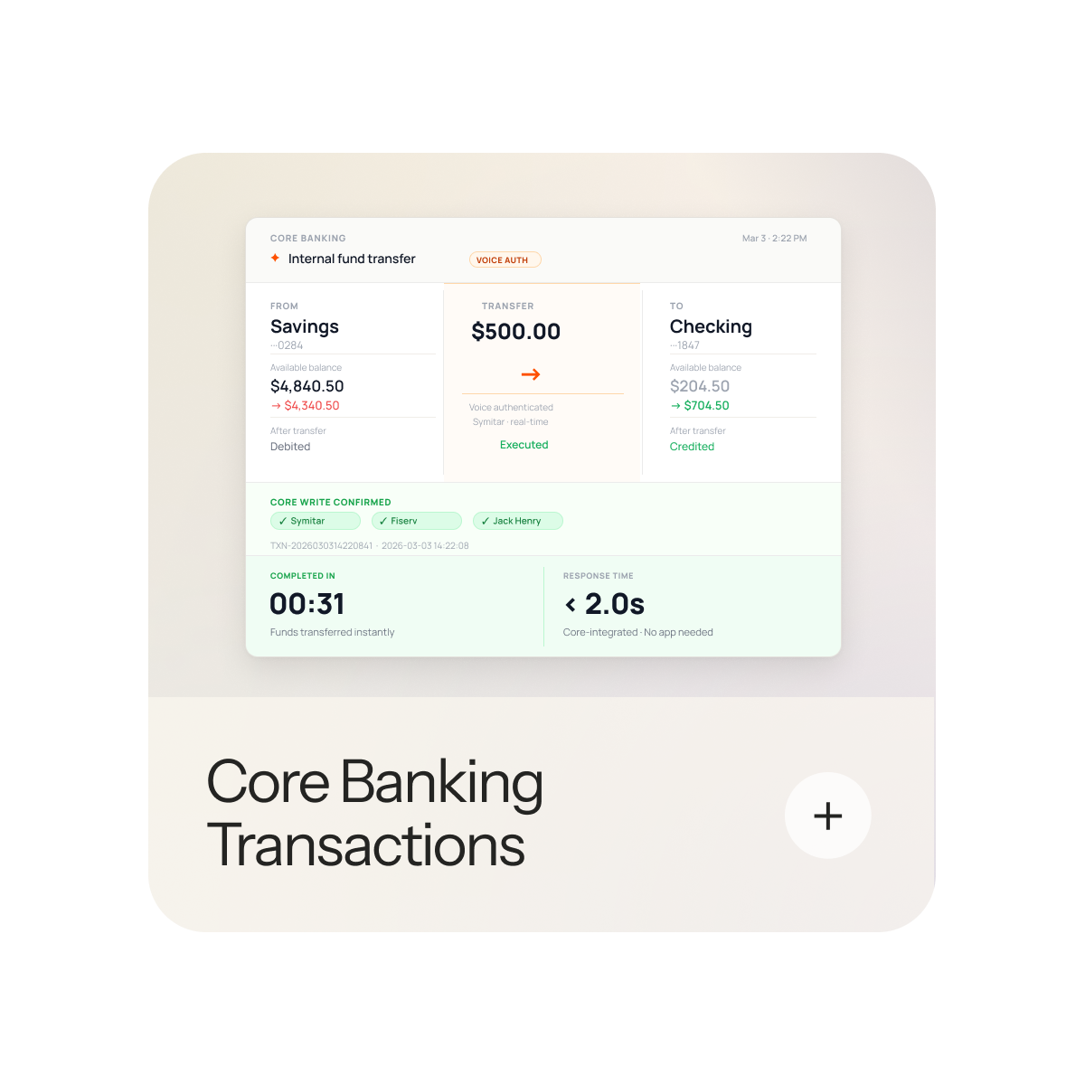 Direct integration with your banking core means members can move money, check balances, and stop payments through voice or chat. Confirmed and complete in the same interaction.